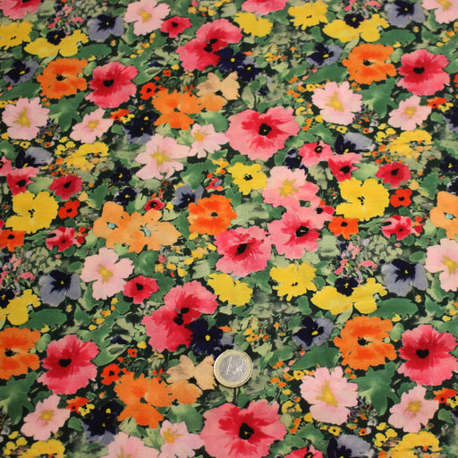 Tissu Viscose fluide REBECCA, floral jaune rose rouge, feuilles vertes - STANDARD 100 OEKO-TEX