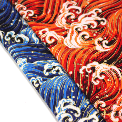 Tissu cotonnade motif japonais VAGUES HOKUSAI dorées, bleu ou rouge - COLLECTION JAPON DORÉ