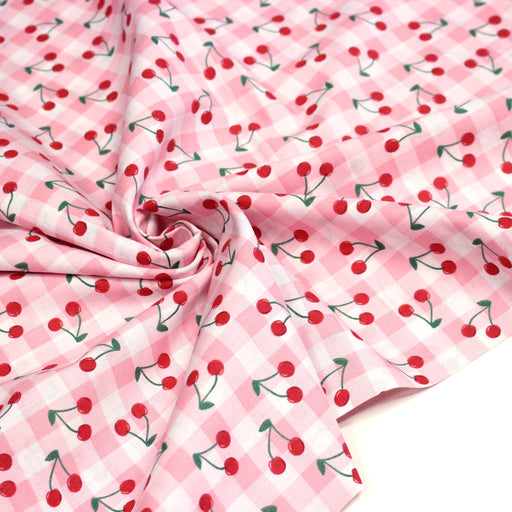 Tissu cotonnade Vichy rose et blanc aux cerises rouges - COLLECTION ÉTÉ