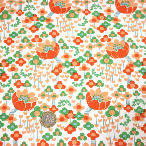 Tissu popeline coton blanc aux fleurs graphiques jaunes et bleues