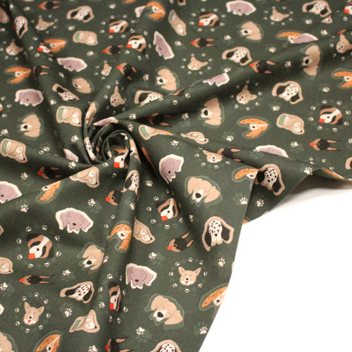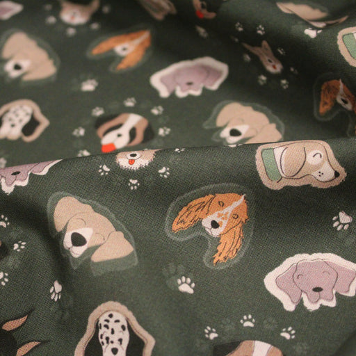 Tissu cotonnade vert anglais aux têtes de jolis chiens, collection AUTOMNE - STANDARD 100 OEKO-TEX