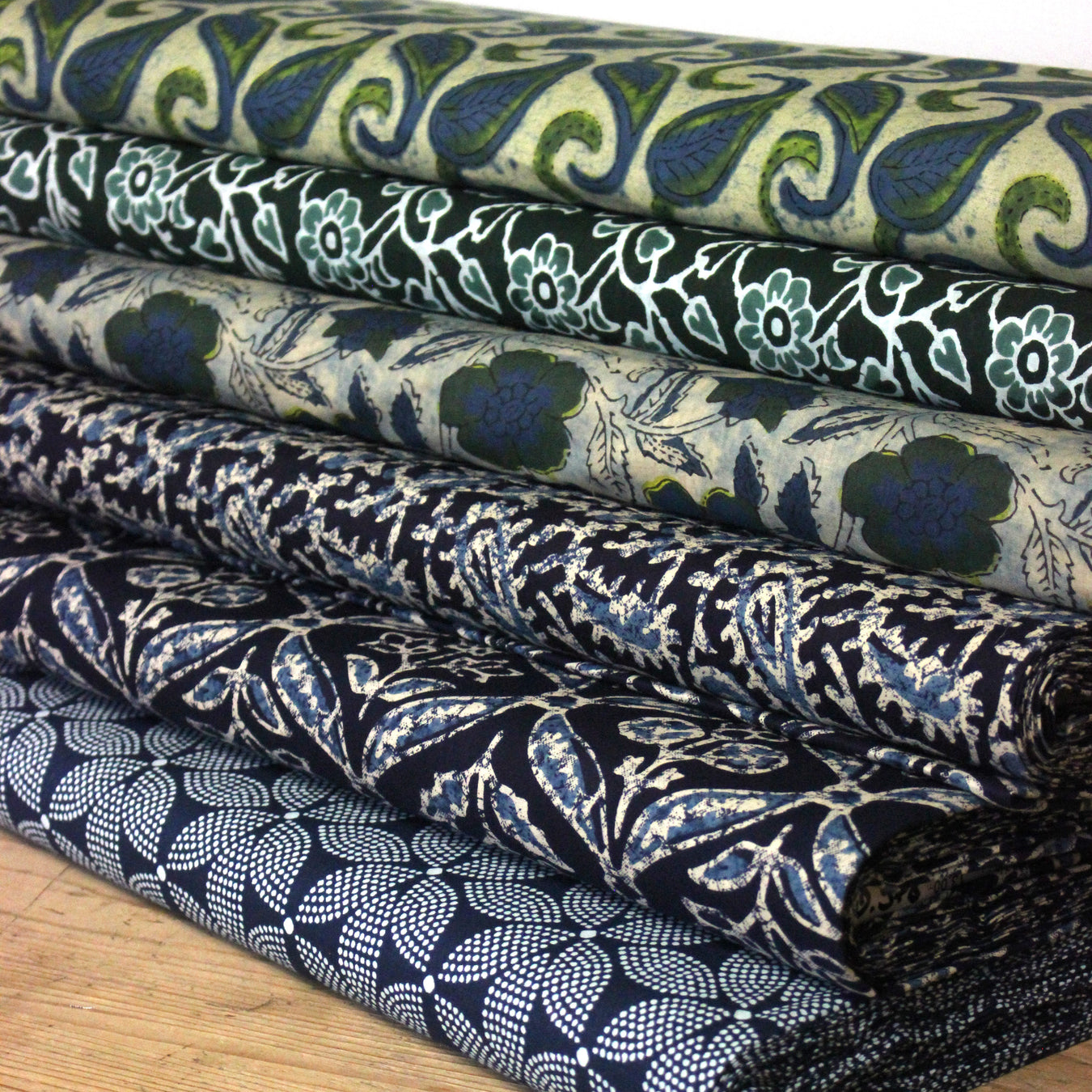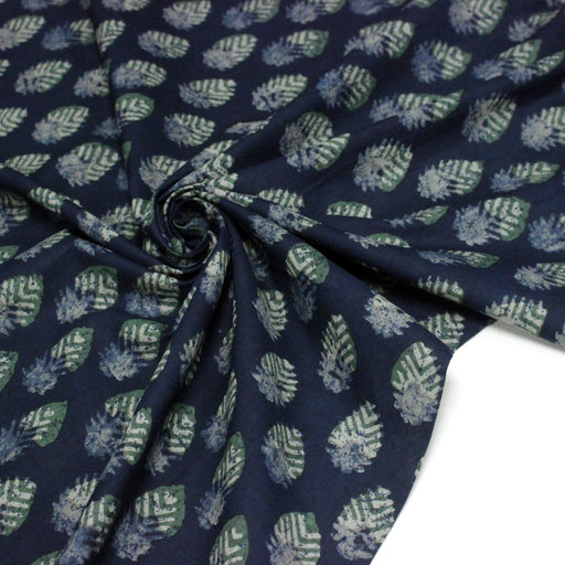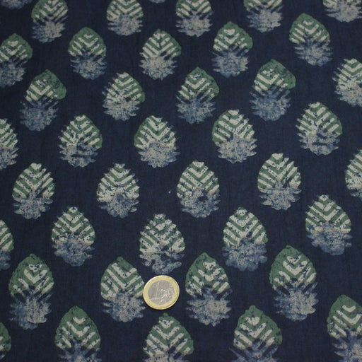Tissu coton fin imprimé INDIENNES, bleu indigo aux fleurs traditionnelles écrues et vertes - STANDARD 100 OEKO-TEX