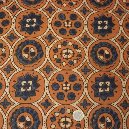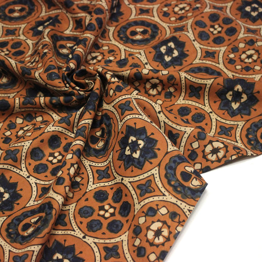Tissu coton fin imprimé INDIENNES, cercles, fleurs et formes, fond ocre - STANDARD 100 OEKO-TEX