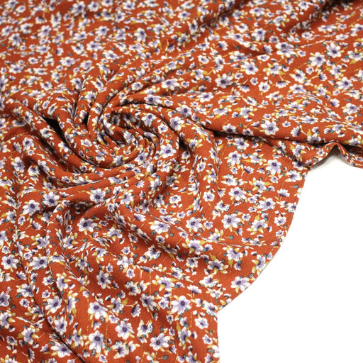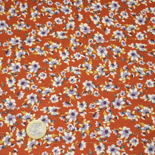 Tissu Viscose crêpe rouille, fleuri blanc & mauve et liserés lurex dorés