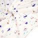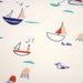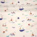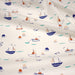 Ce tissu cotonnade blanc se pare d’un motif coloré composé de petits bateaux bleus et oranges,