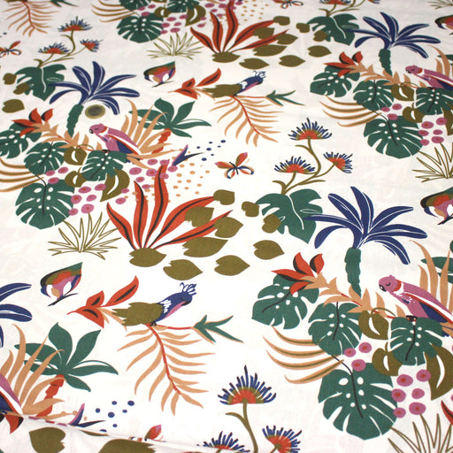 Tissu cotonnade blanc, motif tropical & oiseaux multicolores - STANDARD 100 OEKO-TEX